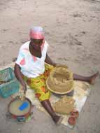 | Djeneba enlève de la matière à l'interieur de sa poterie afin de la rendre plus fine. Puis à l'aide d'un noyau de mangue elle la lisse parfaitement. |
