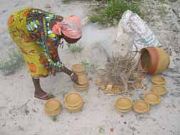 | Djeneba fait un petit feu et dépose les poteries tout autour. |