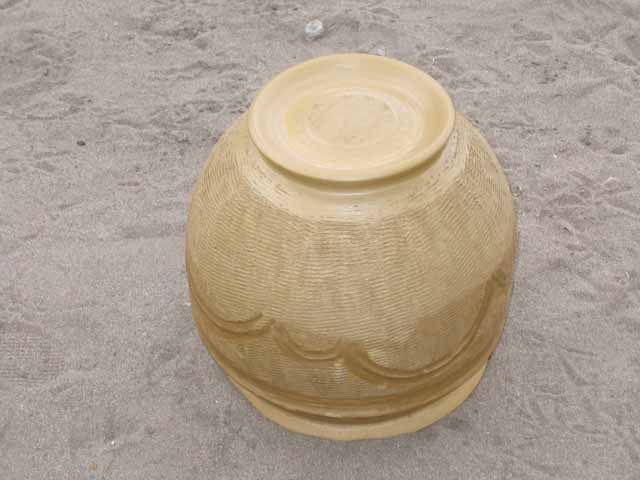 | La boule de terre glaise est déposée dans une grande assiette placée entre les jambes de la potière. |