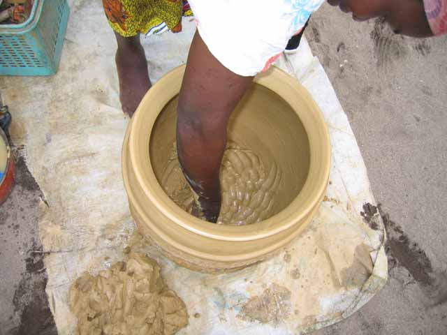 La potière renforce le fond de la poterie en y tassant de la terre glaise. |