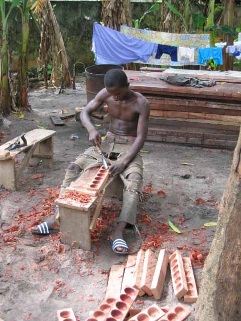 | Sur chacune des deux parties de l'awalé 6 cavités sont creusées à l'aide d'un ciseau à bois et d'un maillet. |