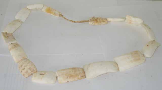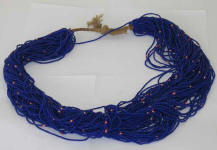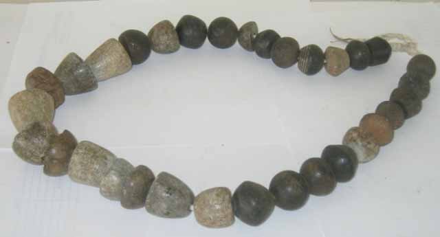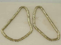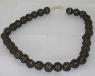 Bijoux et perles anciennes en Afrique. Cette page vous présente des colliers montés mais aussi des chaînes de perles, en bronze, pâte de verre, bois, terre cuite...Ces chaînes de perles sont principalement destinées à des créateurs de colliers ethniques qui vont les utiliser dans leur créations. Cliquez sur les photos si vous souhaitez les agrandir Certaines perles trouvées, ne furent pas importées des pays Européens. Le continent Africain a fabriqués ses perles. On a vu que dans les temps anciens, l’Egypte fut un grand exportateur de perles. Dans plusieurs sites paléolitiques d’Afrique, on trouve des perles constituées dans différents matériaux : graines, os, dents, cauris, etc….. Dans la culture Nok du Nigéria (1er millénaire a.v. J.C), on trouve des statues en terre cuite portant des colliers. Les perles de verres indigènes les plus anciennes furent trouvées au Mapungubwe, en Afrique du sud. Dans l’ancien Bénin (actuellement Nigéria) la fabrication de perles de pierre se développe. Des coiffes et des costumes entiers de perles de corail sont fabriquées pour des cérémonies officielles. Les Ashantis fabriquent de magnifiques bijoux en or, en utilisant la technique de la cire perdu. Dans cette énumération, il ne faut pas oublier tous les objets perlés. Dans la fabrication de ces objets, les perles locales furent remplacées par les perles importées. Chaque sociétés africaines affichent ses valeurs, ses traditions, sa hiérarchie, ses croyances. Par exemple les masques éléphants des Bamiléké du Cameroun, symbole de puissance et de force ; Des grands sièges des Bamouns (Cameroun), des vêtements perlés des Zoulous ou des Ndédélés (Afrique du sud), etc….. Actuellement, on continue ces traditions avec les Bida du Nigéria, les Krobo du Ghana, en Afrique du Sud, en Côte d'ivoire avec des perles en terre, et les Mauritaniennes recommencent à refaire des perles de kiffa.