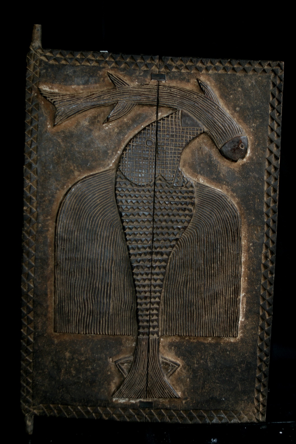 Le volet de grenier à grains est souvent sculpté d'un crocodile (ayo), animal symbolisant à la fois l'eau fécondatrice des cultures et défendant contre les voleurs. Le crocodile (ou caïman) est l'un des animaux totémiques des Dogon vivant dans les falaises de Bandiagara. On le retrouve aussi bien représenté sur les volets, que sur les poteaux de case, les portes, ou les serrures de case ou de grenier. Le crocodile symbolise l'ancêtre binu serou. De même, binu serou symbolise l'un des quatre éléments : l'eau (l'air étant symbolisé par amma serou, la terre par lebe serou, et le feu par diogou serou). Ce volet était très probablement posé sur un grenier appartenant à un prêtre du binu (culte dédié aux ancêtres fondateurs et protecteurs du lignage). Les volets protègent le contenu des greniers essentiellement par leur présence symbolique, ils ne sont donc pas systématiquement munis d'une serrure. D'ailleurs, à ce titre, la serrure peut être considérée comme un ajout symbolique plutôt qu'une réelle protection mécanique. Ceci explique la raison pour laquelle les volets sculptés de motifs ou de représentations n'en ont que rarement, et pourquoi la plupart des volets « simples » sont pourvus d'une serrure. Sculpté par le forgeron du village pour le hogon (chef spirituel et religieux) et les notables, les volets sont un des éléments majeurs de l'art Dogon.