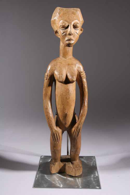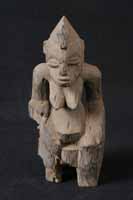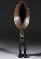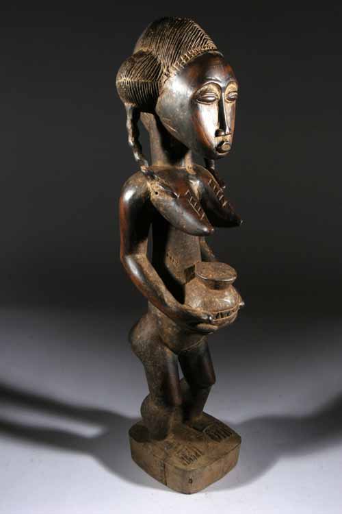 Les effigies Sénoufo féminines, font partie de la statuaire sacrée du Poro, la société initiatique qui a pour mission d’apprendre aux hommes, au cours de trois cycles de sept ans, à s’intégrer dans la communauté. Cette statuette féminine est la représentation d'un esprit de la forêt (appelé mandeo, tugu ou ndeo). Le buste fait office de couvercle à un récipient lui-même sculpté sur un tabouret Senoufo à quatre pieds. Les mains et le torse se fondent dans le volume de l'objet, comme plongés dans le bol au travers du couvercle. Une telle statuette constitue l'essentiel du matériel dont dispose le devin guérisseur (sando). Elle sert à la fois de réceptacle aux esprits de la forêt sensés être en relation avec le devin, et leurs donne également un visage. La statue baoulé.